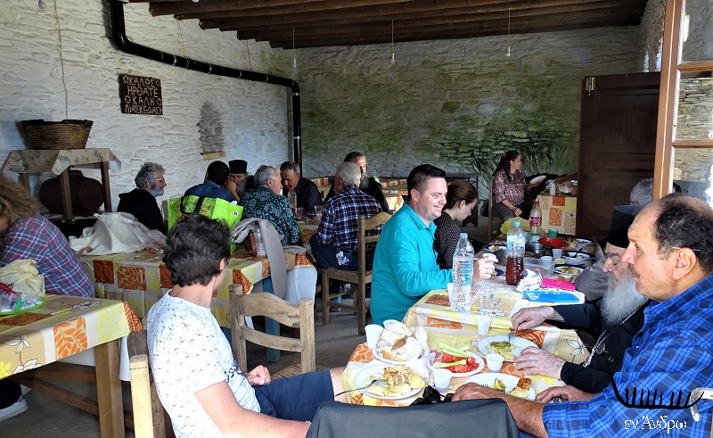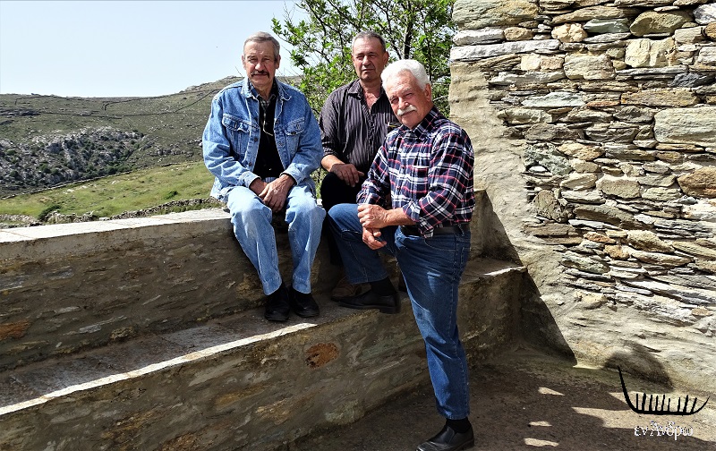 Και οι ξωμάχοι της περιοχής, γνωστοί μας από προγενέστερη επίσκεψη μας στο γειτονικό Φραγκάκι: ο Χρήστος και ο Θόδωρος που έχουν κονάκια στο Φραγκάκι και ο Γιάννης, που είναι ξυλουργός κι έχει κονάκι στη Ράχη. Και οι τρεις "χορηγοί" του μικρού ξεχασμένου μοναστηριού χτίζοντας πέτρες, αναστυλώνοντας μισογκρεμισμένους τοίχους και επισκευάζοντας παράθυρα και φτιάχνοντας τραπέζια...