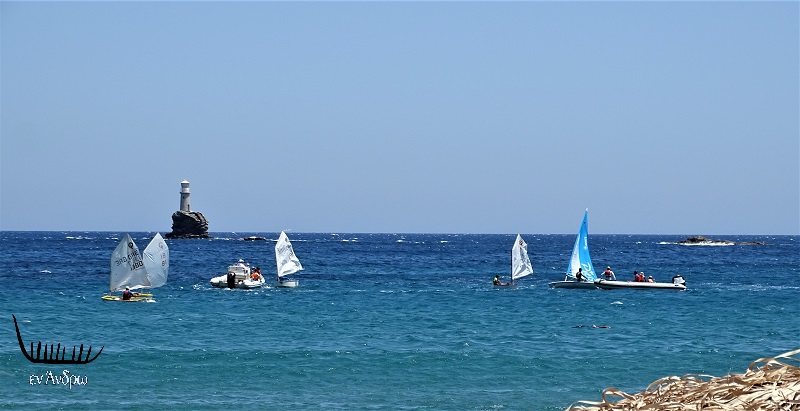 Όμως η Χώρα του καλοκαιριού περιλαμβάνει καθημερινά και άλλα πολλά. Περιλαμβάνει το λαμπρό θέαμα των μικρών ιστιοπλόων του ΝΟΑ που ο προπονητής τους Φώτης Σταυρίδης τους ταξιδεύει με το μελτέμι στο Νειμποριό. Εδώ σε αυτές τις σκληρές ιστιοπλοϊκά συνθήκες έμαθαν και τα παιδιά μας την θάλασσα…