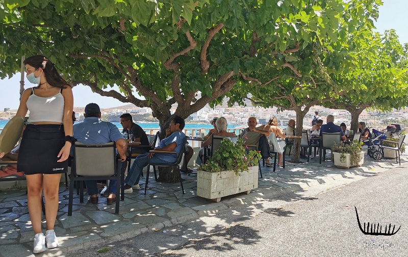 Συνωστισμός και στο ουζερί του Στυλιανού. Δεν υπήρχε καρέκλα Κυριακή και Δευτέρα τα απομεσήμερα του καύσωνα. Ηλικιωμένοι και νεώτεροι που δεν άντεχαν τη ζέστη κάτω από τις καταπράσινες μουριές. Σήμα κατατεθέν του καλοκαιριού στο Νειμποριό. Σήμα κατατεθέν και η ωραία σερβιτόρα με την μάσκα για να μην ξεχνάμε την πανδημία της εποχής...