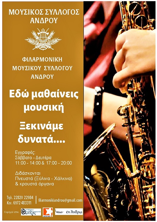 Μετά την δύσκολη εποχή της πανδημίας όπου έκλεισαν ή απενεργοποιήθηκαν πάρα πολλά πράγματα και ομαδικές δραστηριότητες που έχουν σχέση με τον πολιτισμό η Φιλαρμονική του Μουσικού Συλλόγου Άνδρου ξεκινά τη νέα μουσική της χρονιά και μας περιμένει - μικρούς και μεγάλους - να γνωρίσουμε από κοντά τον υπέροχο κόσμο της μουσικής. Στη σχετική αφίσα υπάρχουν πληροφορίες για εγγραφές νέων μελών.