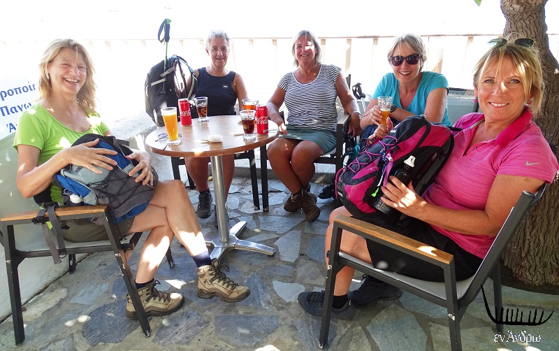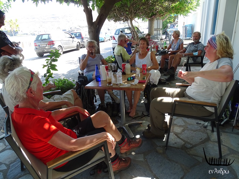 Την ώρα που μαζεύουμε τα πράγματα μια μεγάλη παρέα ξένων που μιλάνε κάτι σαν γερμανικά μας κοιτά ερευνητικά. Η επικεφαλής πλησιάζει ρωτά ευγενικά στα ελληνικά: "φεύγετε;" Απαντάμε ναι. Χαρούμενη μας ευχαριστεί λέγοντας σε μερικές κυρίες από την μεγάλη παρέα των ξένων που ακολουθεί να πιάσουν το τραπέζι. Οι κυρίες κάθονται και παραγγέλλουν αναψυκτικά και μπύρες. Ρωτάμε από που είναι. Η απάντηση: "από Ολλανδία". Οι μισές από Χάγη, οι άλλες από Ρότερνταμ, Άμστερνταμ και Μάαστριχτ. Στην ερώτηση "πως και ήρθαν στην Άνδρο και αν τους αρέσει" η απάντηση ένα ομόφωνο ναι. Ήρθαν με τον ταξιδιωτικό οργανισμό SNP για να περπατήσουν στα μονοπάτια του νησιού...