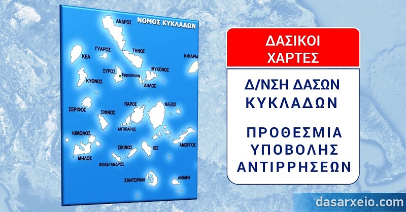 Με απόφαση της Διεύθυνσης Δασών Κυκλάδων παρατείνεται η προθεσμία υποβολής αντιρρήσεων κατά τού περιεχομένου των δασικών χαρτών των Περιφερειακών Ενοτήτων Σύρου, Άνδρου, Τήνου, Νάξου, Θήρας, Κέας- Κύθνου, Πάρου, Μήλου, Μυκόνου