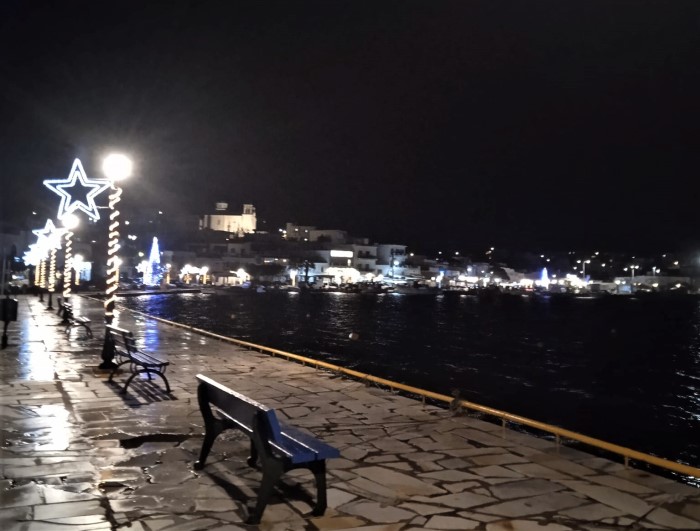 Αλλά και ολόκληρη η παραλία και το λιμάνι κι εφέτος στολισμένα δίνουν τον τόνο των εορτών. Το Γαύριο μοναχικό και νυχτερινό - όπως το αποτύπωσε η αναγνώστρια μας - γιορτάζει για όσους το αγαπούν. Όσους αγαπούν την Άνδρο. Όσους αγαπούν το νησί με την παράξενη μοναχικότητα που απλώνει παντού τον χειμώνα...