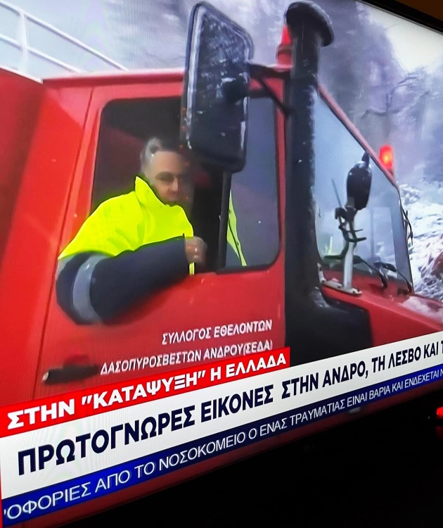 ¨Ήδη από χτες η Άνδρος είναι σε πανελλήνια κάλυψη με τον Σκάι να είναι παρών στο νησί. Χτες βράδυ το συνεργείο του βγήκε σε απευθείας σύνδεση από τον Αμόλοχο με τον δήμαρχο να μιλά και να εξηγεί την κατάσταση. Η παραπάνω φωτογραφία από το μεσημεριανό δελτίο του Σκάι με τον δήμαρχο στο αυτοκίνητο με το μαχαίρι του ΣΕΔΑ στην Βουρκωτή. Σήμερα το πρωί είχε σύνδεση με Άνδρο το OPEN στην οποία μίλησε ο δήμαρχος περιγράφοντας την πυκνή χιονόπτωση της νύχτας και τις διανοίξεις δρόμων που έχουν ήδη ξεκινήσει σε όλο το νησί...
