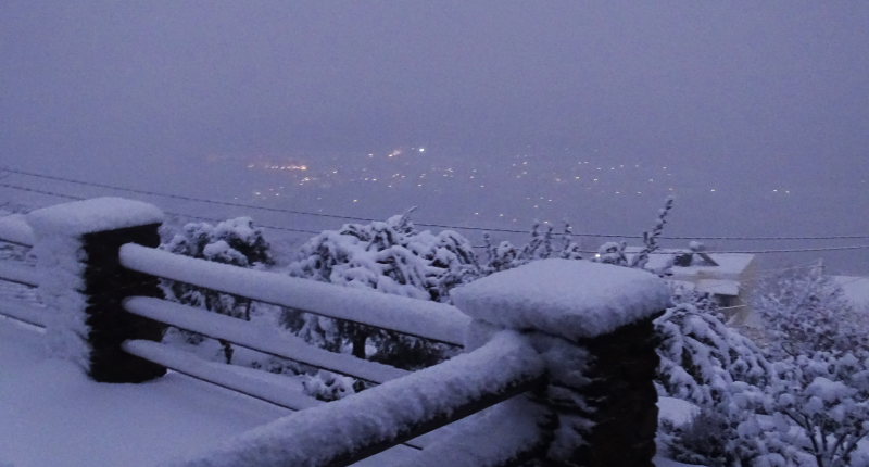 Λίγο νωρίτερα η Χώρα από το Υψηλού σε ώρα χιονόπτωσης. Όχι τόσο πυκνής έτσι μπορούν και φαίνονται μέσα από την λευκή κουρτίνα του χιονιού αμυδρά τα φώτα της Χώρας.