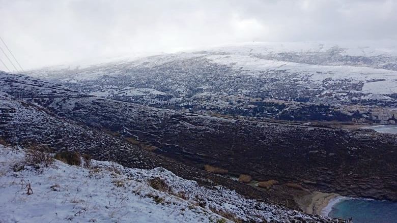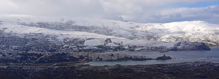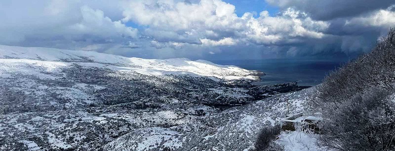 Τα βουνά Πέταλο, Ζένος και άλλες κορυφές. Χιόνι με φόντο την Χώρα μέχρι την θάλασσα.