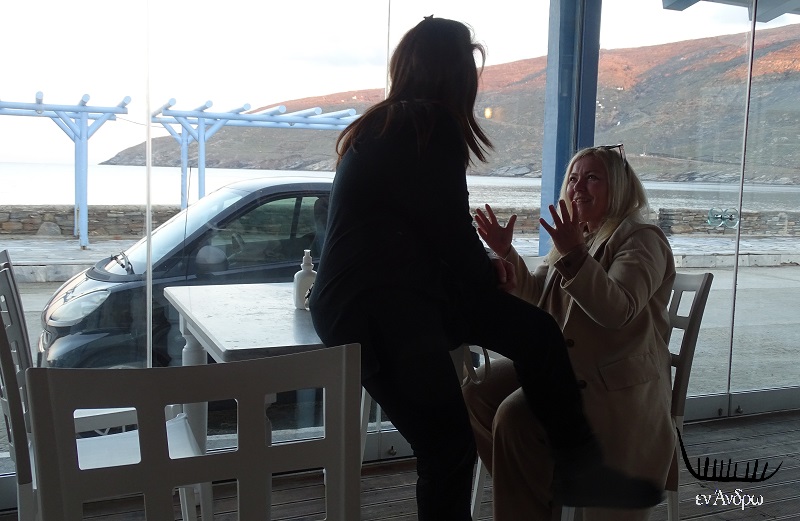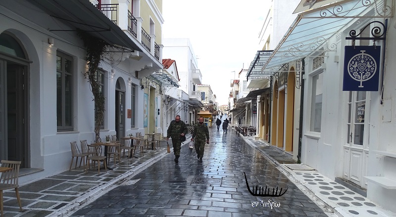 Δεύτερη στάση Χώρα. Μουσκεμένη, πρωινή, με λίγους κατοίκους κι επισκέπτες να ανεβοκατεβαίνουν στον πεζόδρομο. Πρώτη συνάντηση ο διοικητής της Εθνοφρουράς Κυκλάδων από την Σύρο με τον διοικητή της Εθνοφρουράς Άνδρου. Έχει έρθει ο αντισυνταγματάρχης για επίσκεψη στην Άνδρο. Θα πάει και στην Πανάχραντο πριν φύγει. Με χαιρετούν εγκάρδια και μιλάμε για τον σημαντικό ρόλο της Εθνοφρουράς στον μεγάλο χιονιά.