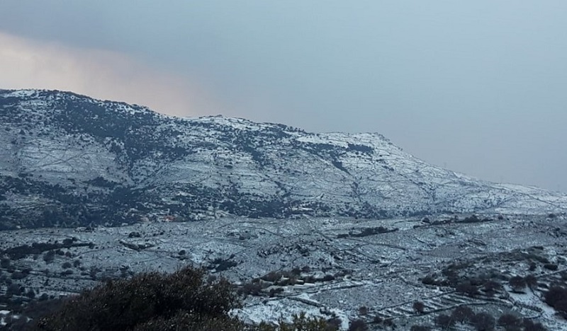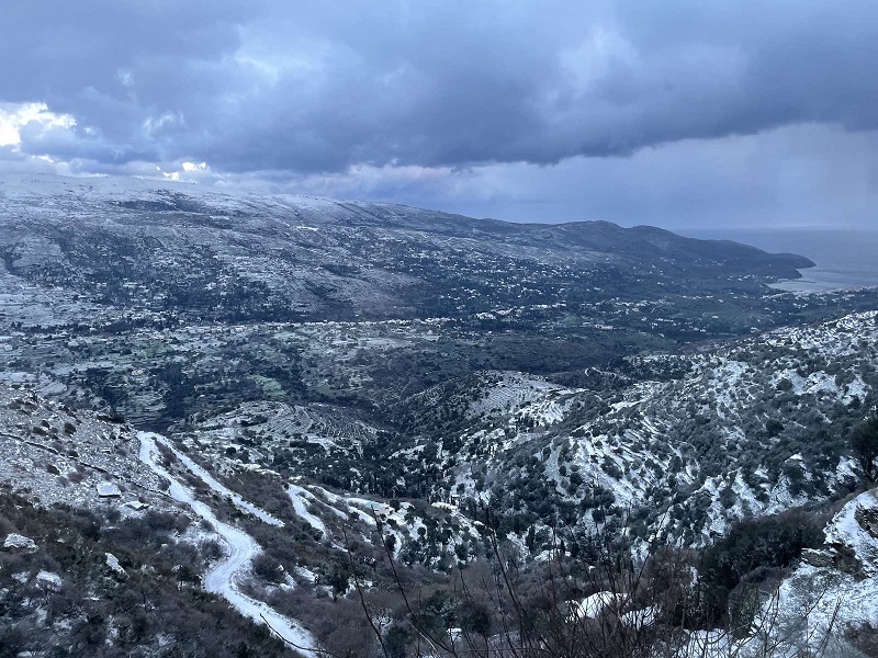 Μια πρώτη εικόνα της κατάστασης στην περιοχή του Κορθίου έχουμε από αυτή την φωτογραφία από την περιοχή της Πίσω Μεριάς. Εικονίζεται η κοιλάδα του Κορθίου χιονισμένη σχεδόν μέχρι τη θάλασσα.