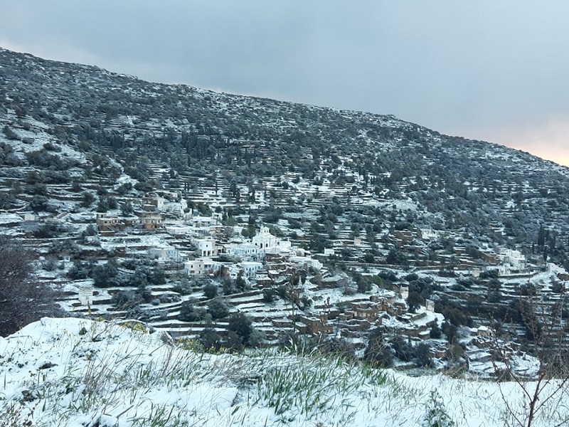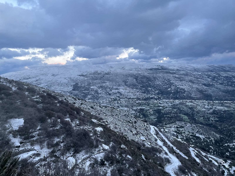 Και μια γενική άποψη της κοιλάδας της Χώρας σήμερα το πρωί. Χιόνια στους Γερακώνες. Χιόνια και στο Πέταλο μέχρι πάνω από τις Μένητες.