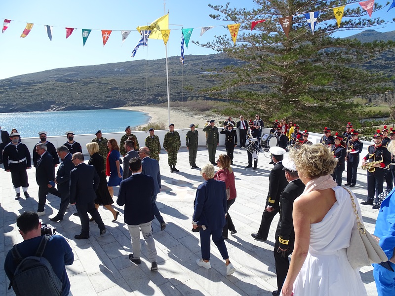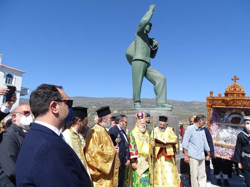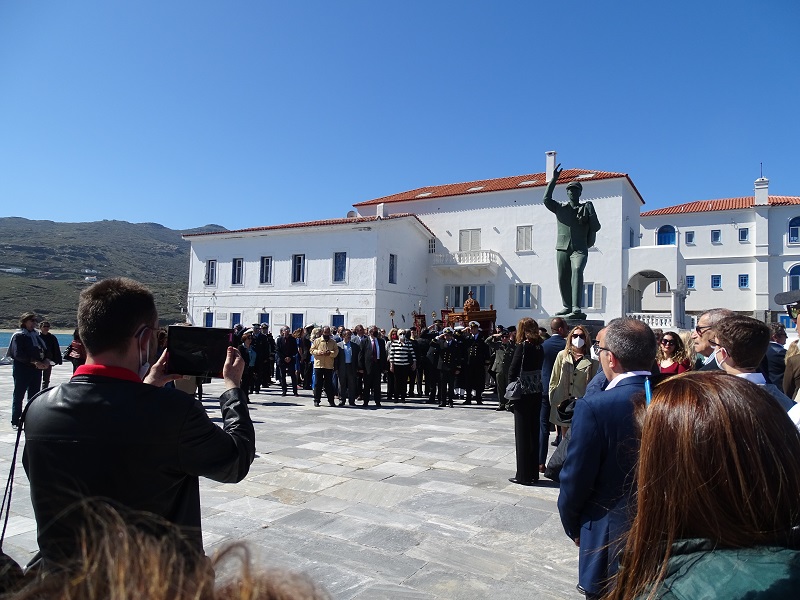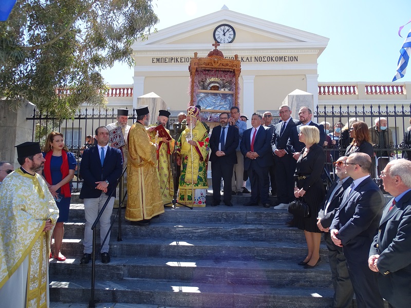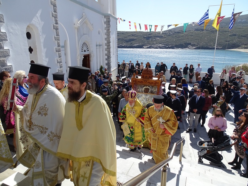 Η λιτανεία στη συνέχεια κατέληξε στη πλατεία Γηροκομείου όπου εψάλη δέηση και εκφωνήθηκαν οι πανηγυρικοί της ημέρας. Πρώτος μίλησε ο μητροπολίτης Δωρόθεος ΙΙ μίλησε με λόγια θερμά για την γιορτινή μέρα, αλλά και τους δύσκολους καιρούς που περνάμε. Εξέφρασε δε την οδύνη του που δύο ομόδοξοι λαοί πολεμούν στα βόρεια της χώρας μας. Κι ευχήθηκε να επικρατήσει η ειρήνη. Δεύτερος ο περιφερειάρχης Νοτίου Αιγαίου μίλησε με λόγια θερμά για τους νησιώτες που έχουν στο DNA τους την θάλασσα, το ταξίδι και την αναζήτηση. Μίλησε θερμά και για τα καράβια και την ακτοπλοΐα που είναι οι διαδρομές μας στον κόσμο. Και χαιρέτισε την παρουσία των τριών ακτοπλόων στην πανανδριακή εορτή.