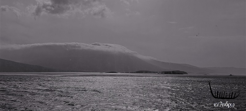 Καιρός περίεργος. Μετά το ανοιξιάτικο κι ολόλαμπρο Πάσχα μια μουντή κρύα Πρωτομαγιά. Ή, τουλάχιστον αυτό λέει η πρόγνωση της Κουβάρας. Ένα τεράστιο λευκό σύννεφο σαν χιόνι ή σαν σεντόνι έχει σκεπάσει από το πρωί - ανήμερα της Ζωοδόχου Πηγής - την Κουβάρα στην Άνδρο. Το λευκό σύννεφο κατά παράξενο τρόπο έχει καθίσει σε όλο το μήκος της βουνοσειράς συμμετρικά πάνω στο βουνό ακολουθώντας τις καμπύλες του. Η φωτογραφία είναι από την γέφυρα του Superferry...