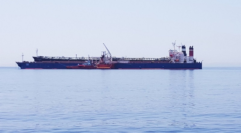 Τηλεφωνούμε στο Superferry που ακολουθεί στην ρότα και ζητάμε από μέλος του πληρώματος φωτογραφία για την υπό εξέλιξη μεταφόρτωση των 100.000 τόνων πετρελαίου. Έρχονται σε λίγα λεπτά δύο φωτογραφίες των δύο πετρελαιοφόρων, το δίπλα στο άλλο να μεταφορτώνουν το φορτίο. Οι πληροφορίες που συλλέγουμε λένε πως η μεταφόρτωση έχει ξεκινήσει μερικές μερες και θα διαρκέσει αρκετές. Όπως φαίνεται και στο AIS υπάρχoyn δίπλα σε ετοιμότητα tr;ia ρυμουλκ;a για παν ενδεχόμενο, ενώ έχουν απλωθεί φράγματα γύρω από τα πλοία για τυχούσα αστοχία που οδηγήσει στο να χυθεί πετρέλαιο στη θάλασσα.