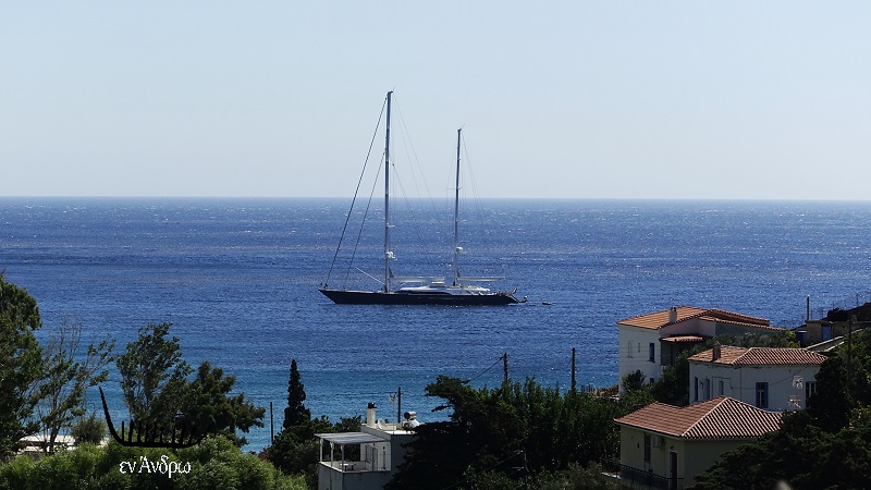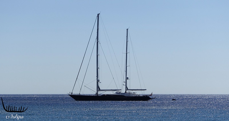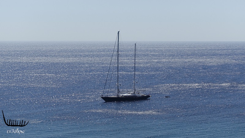 Τι ήταν αυτό που το έφερε από την κοσμοπολίτικη Μύκονο στην φυσιολατρική Άνδρο; Άγνωστο. Όμως το υπέροχο σκάφος ήταν εδώ. Και αυτή ήταν η πραγματικότητα και γι' αυτό και για εμάς που απολαμβάναμε την θάλασσα και το κολύμπι με σκηνικό το ξεχωριστό δικάταρτο...