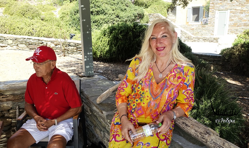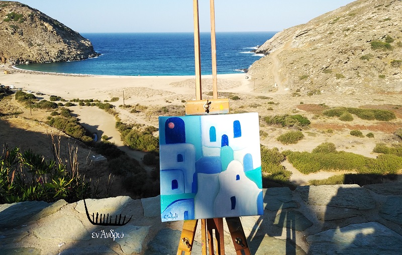 Και εδώ η ζωγράφος-γκαλερίστα Ελένη Σακαλή, που διατηρεί γκαλερί στην Κηφισιά και με το έργο της που ζωγράφισε στον Ζόργκο ξεκινήσαμε την σημερινή ξενάγηση μας για την επιστροφή του μοναδικού ξενοδοχείου στον ιδιοκτήτη του και στα καλοκαιρινά δρώμενα της Άνδρου...