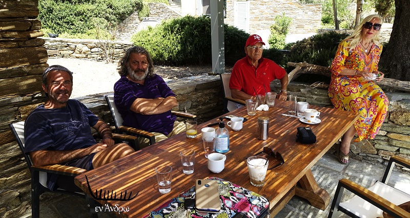 Βρήκαμε τον Ακύλα στο υπαίθριο καθιστικό του ξενοδοχείου. Με κόσμο εκλεκτό. Ανθρώπους κύρους. Επιχειρηματίες. Γιατρούς. Καλλιτέχνες. Από αριστερά ο καθηγητής Κωνσταντίνος Στρατάκης, ο Ακύλας, ο πρώην διευθύνων σύμβουλος μεγάλων αμερικανικών εταιρειών Δρ. Σπύρος Αποστόλου και η ζωγράφος-γκαλερίστα Ελένη Σακαλή.