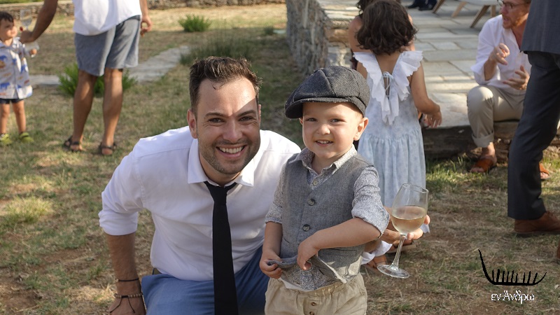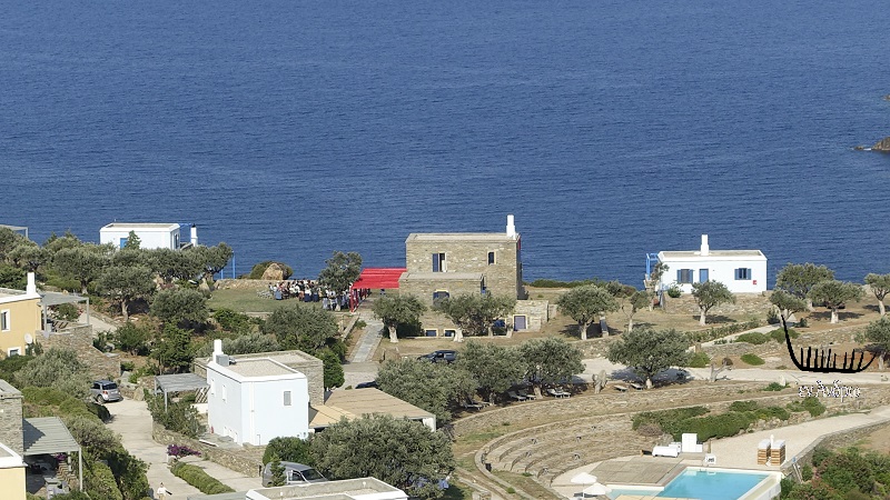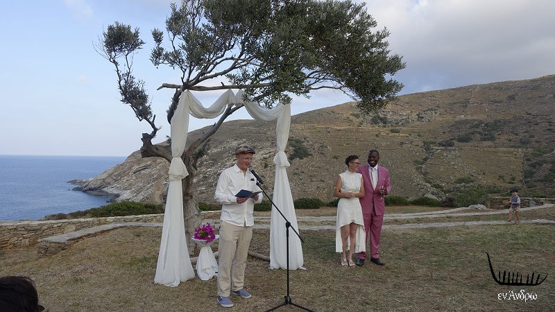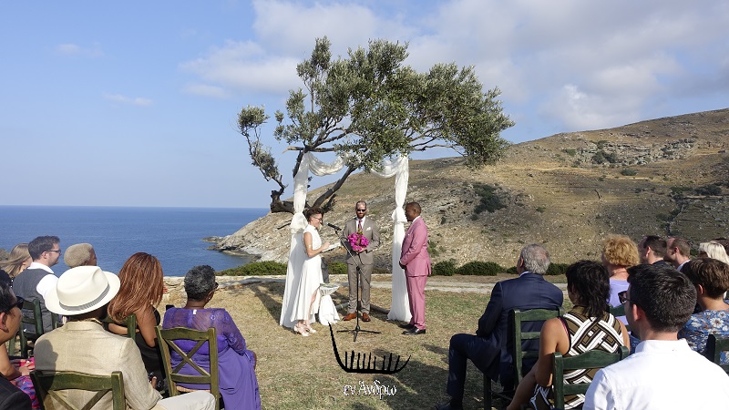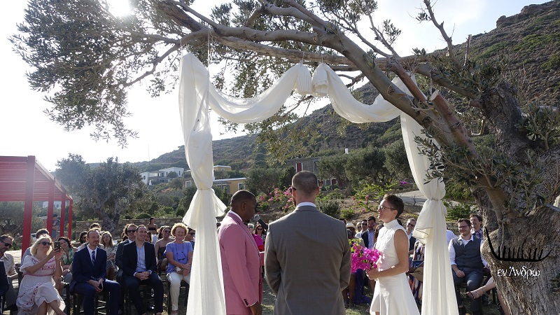 Ο χώρος της τελετής με μια λέξη: ΜΟΝΑΔΙΚΟΣ!!! Κάτω από μια υπέροχη ελιά, ένα λιτό σκηνικό με φόντο την μαγική παραλία του Ζόργκου. Ο ήλιος του Σεπτεμβρίου απαλός, ο αέρας ιδανικός, ο καιρός τέλειος. Ο Βούδας έβαλε το χέρι του και η Άνδρος τα καλά της να υποδεχτεί το νέο ζευγάρι μέσα σε ένα λαμπερό σκηνικό...