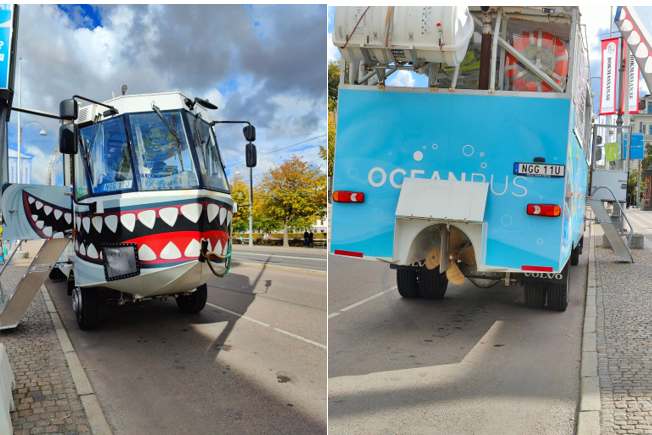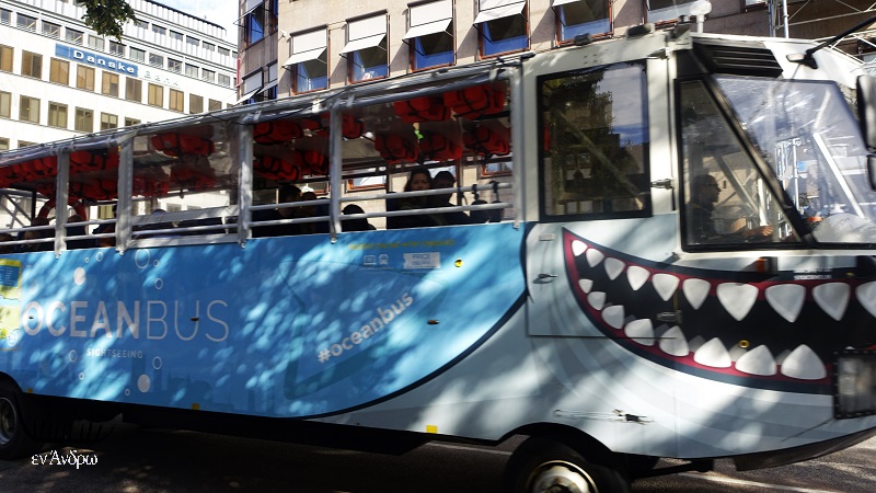 Ιδού ένας μάλλον απίθανος τρόπος που βρήκαν οι Σουηδοί να εντυπωσιάζουν τους επισκέπτες και να τους κάνουν να επιλέγουν αυτό τον μοναδικό τρόπο ξενάγησης. Το OceanBus όπως το ονόμασαν είναι ειδικής κατασκευής. Αποτελείται από ένα βανάκι Volvo και μια σειρά πατέντες που έγιναν στην Αμερική που το έστειλαν και το μετέτρεψαν σε αμφίβιο. Αυτά μου εξηγούν μια ηλιόλουστη Κυριακή του φθινοπώρου στο κέντρο της Στοκχόλμης καθώς αυτό πέρασε από μπροστά μας.