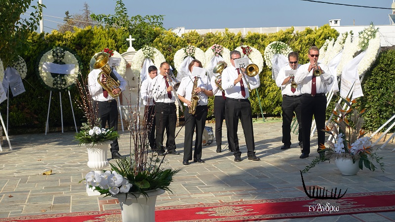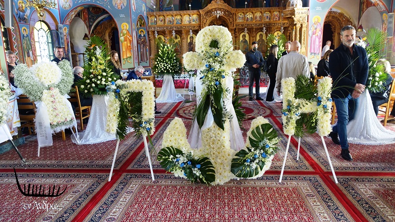Από τα δεκάδες στεφάνια ξεχωρίσαμε την ανθοστόλιστη σύνθεση της οικογένειας που αποτελείτο από τα αρχικά του εκλιπόντος και μια ολάνθιστη άγκυρα.