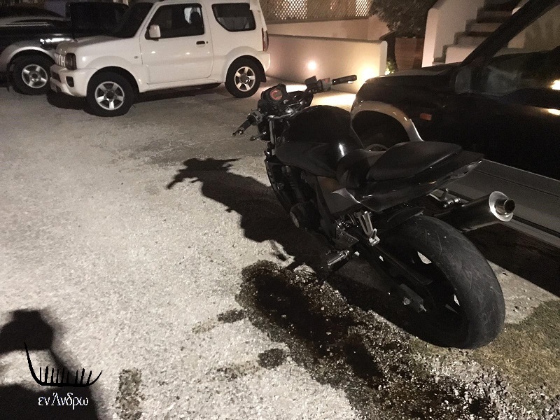Η επίμαχη μοτοσυκλέτα, της οποίας έσπασε το σασμάν αν κρίνουμε από τα χυμένα λάδια δίπλα της.