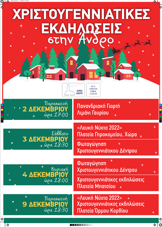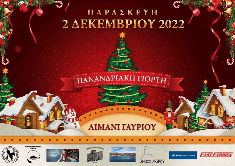 Καλές γιορτές σε όλο τον κόσμο! Να ευχηθούμε ο ντόπιος κόσμος να κινηθεί στις εκδηλώσεις αυτές και να καταναλώσει το όποιο ελάχιστο δυνατό ποσό (δεν μας μένουν και πολλά κάθε μήνα άλλωστε με τα χαράτσια που πληρώνουμε) του έχει απομείνει. Να στηριχθεί η τοπική αγορά ΟΛΗΣ της Ανδρου! Ελπίζουμε και στη συνέχιση των εκδηλώσεων που θα υποστηρίξει ο Δήμος του νησιού, καθώς από την λευκή νύχτα στο Κόρθι απέχει σχεδόν 20 ημέρες η λήξη της χρονιάς και υπάρχει αρκετός κόσμος, αλλά και επιχειρήσεις που λειτουργούν και το χειμώνα (αρα και στις ημέρες των Χριστουγέννων).