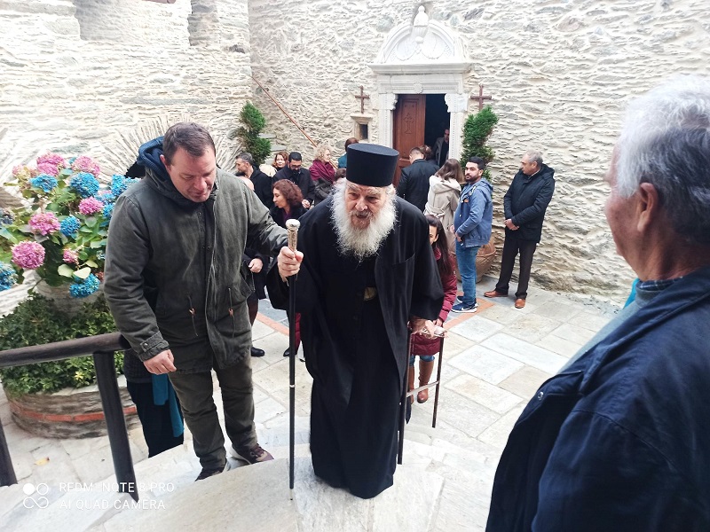 Ο Γέροντας Ευδόκιμος υποβοηθούμενος ανεβαίνει τα σκαλιά πηγαίνοντας μετά την λειτουργία προς την τραπεζαρία της Μονής...