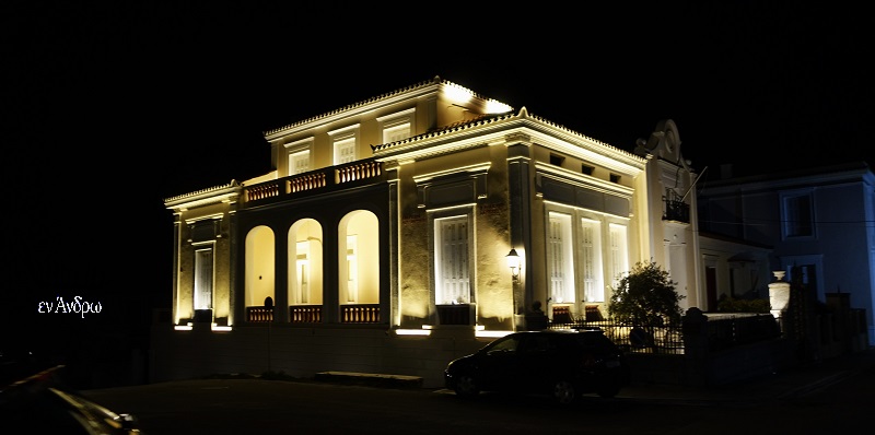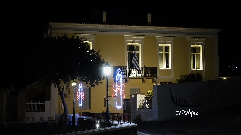 Και το δημαρχείο ολόφωτο με τον πασχαλινό φωτισμό δείχνει έτσι εορταστικό και ξεχωριστό σε σχέση με το παρελθόν. Η Άνδρος έχει γυρίσει σελίδα...