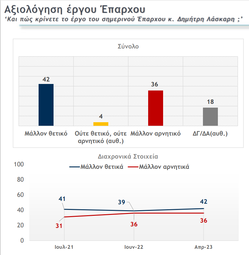 Ο έπαρχος Δ. Λάσκαρης κινείται σταθερά σε θετικό πρόσημο όλη την τετραετία. Από +10% (το 2021) μέχρι +6% (το 2023). Λογικό γιατί το έργο της Περιφέρειας (χρηματοδοτήσεις κλπ) ενσωματώνεται στις περισσότερες περιπτώσεις στο δημοτικό έργο μιας και είναι ο Δήμος που εκπονεί τις μελέτες και εκτελεί τα έργα. Η Περιφέρεια δια του επάρχου και του περιφερειάρχη συνεργάζονται άψογα με τον δήμαρχο και τα χρηματοδοτούν. Έτσι, δεν φαίνονται. Επιπλέον, το μεγάλο έργο αξίας 2.000.000 ευρώ που ετοίμασε ο έπαρχος για την ασφαλτόστρωση του επαρχιακού δικτύου, μελετήθηκε, χρηματοδοτήθηκε, δημοπρατήθηκε το 2021. Και δεν ξεκίνησε ποτέ εδώ και δύο χρόνια μπλέκοντας σε ενστάσεις και εφέσεις των ανταγωνιστριών εταιρειών. Και μόλις τον Απρίλιο του 2023 ξέμπλεξε δικαστικά και θα ξεκινήσει μέχρι το τέλος του έτους.