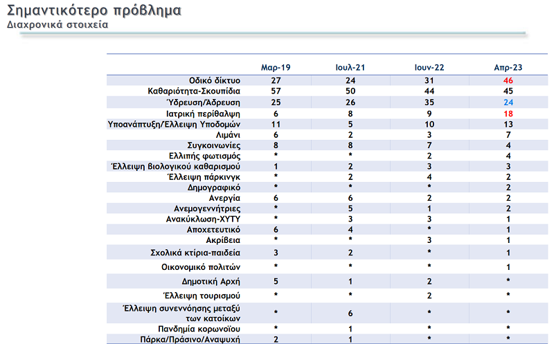Από τα 22 προβλήματα της λίστας που τέθηκε υπόψη των δημοτών της Άνδρου 5 αξιολογήθηκαν ως κυριότερα. Και τα 5 αξιολογούνται ως κυριότερα από το 2019. Και αυτά είναι: καθαριότητα, οδικό δίκτυο, ύδρευση, ιατρική περίθαλψη, έλλειψη υποδομών. Στην καθαριότητα όμως υπάρχει σαφής βελτίωση κατά 12% στην 4ετία. Στα άλλα προβλήματα αναγνωρίζονται σε μεγάλο βαθμό στο οδικό δίκτυο. Η έλλειψη υποδομών κινείται σε χαμηλά νούμερα. Η ιατρική περίθαλψη δείχνει απότομη χειροτέρευση το 2023.