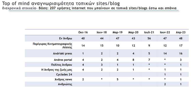 Η σταθερή πολιτική και επικοινωνιακή κυριαρχία του Εν Άνδρω όλα τα χρόνια συνεχίζεται και αυτή τη χρονιά Με 48% είναι η πρώτη επιλογή για ειδησεογραφία, αρθρογραφία, ρεπορτάζ. Το Εν Άνδρω προηγείται 31% του Περίγυρου και 32% της Ανδριακής.