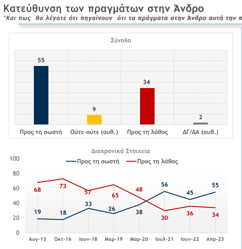 Κι εφέτος το κλίμα καταγράφει μια ακόμα θετική αποτύπωση με το 55% να δηλώνει πως η Άνδρος πάει στη σωστή κατεύθυνση, ενώ μόνο το 34% δηλώνει πως πάει αρνητικά. Η πραγματικότητα λοιπόν στο νησί είναι σε πλήρη αντίθεση με το αρνητικό κλίμα που καλλιεργεί όλα αυτά τα χρόνια η ενωμένη αντιπολίτευση.