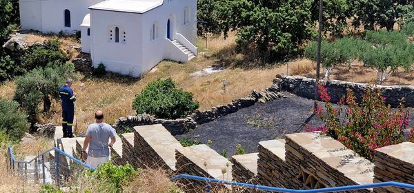Η φωτιά έχει κατασβεστεί εγκαίρως και ο επικεφαλής του πυροσβεστικού κλιμακίου Άνδρου Δ. Πρινιωτάκης επιβλέπει την καμένη έκταση.