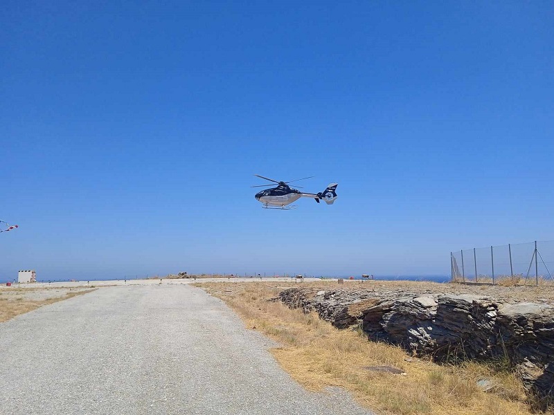 Λίγο μετά τις 13:00 έφτασε στο ελικοδρόμιο της Χώρας πολιτικό ελικόπτερο με VIP ξένους επισκέπτες. Το ιδιωτικό ελικόπτερο περίμενε κάνοντας κύκλους μέχρι να φύγει το στρατιωτικό ελικόπτερο με την ασθενή για Σύρο. Μετά προσγειώθηκε στις 13:35 αποβιβάζοντας 3 επιβάτες. Και αμέσως αναχώρησε (στις 13:45)..