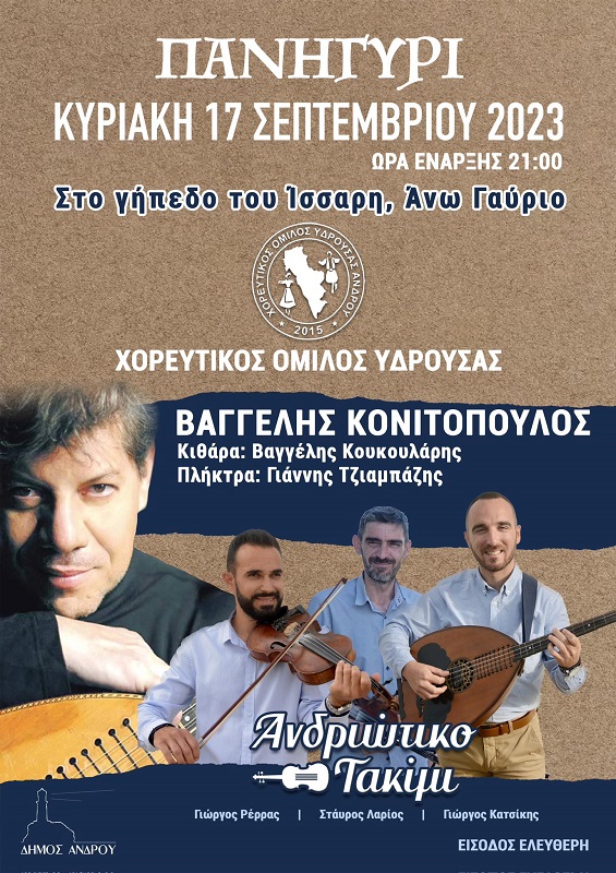 Και όσοι είστε από Υδρούσα και δεν προλαβαίνετε να πάτε και να έρθετε στην Χώρα το Σάββατο υπάρχει και η εναλλακτική της Κυριακής 17 Σεπτεμβρίου και το μεγάλο μουσικό γλέντι στο Άνω Γαύριο, του Χορευτικού Όμιλου Υδρούσας. Προφανώς δεν είναι τυχαίο πως ο Χορευτικός Όμιλος Υδρούσας διοργανώνει Κυριακή 17 Σεπτεμβρίου το ετήσιο καλοκαιρινό γλέντι του.