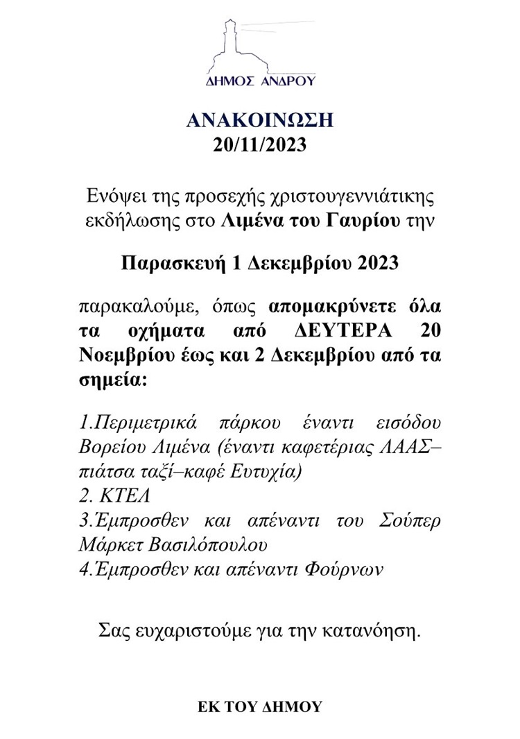 Ακολουθεί ανακοίνωση του Δήμου Άνδρου για τον περιορισμό του πάρκινγκ σε όλη την διάρκεια της προετοιμασίας της γιορτής (20 Νοεμβρίου με 1 Δεκεμβρίου) σε μια σειρά σημεία στο λιμάνι για να μην εμποδιστούν οι προετοιμασίες της γιορτής: