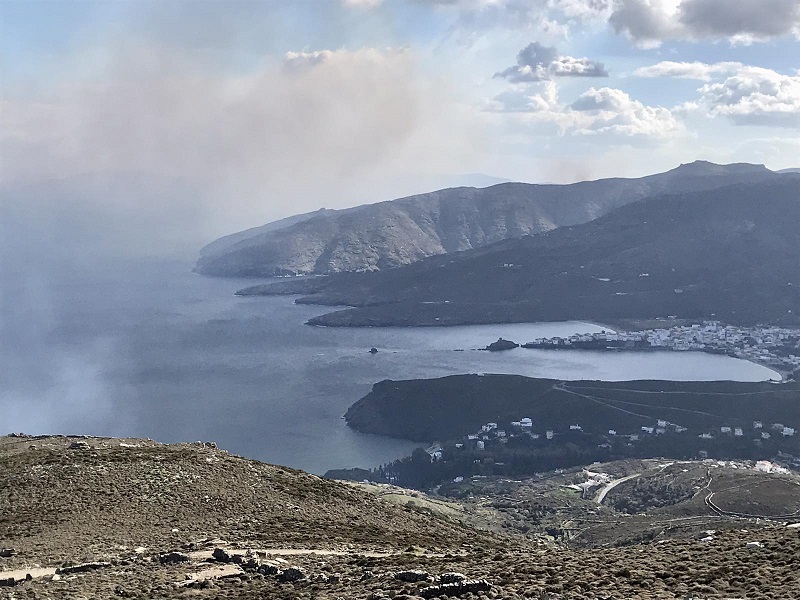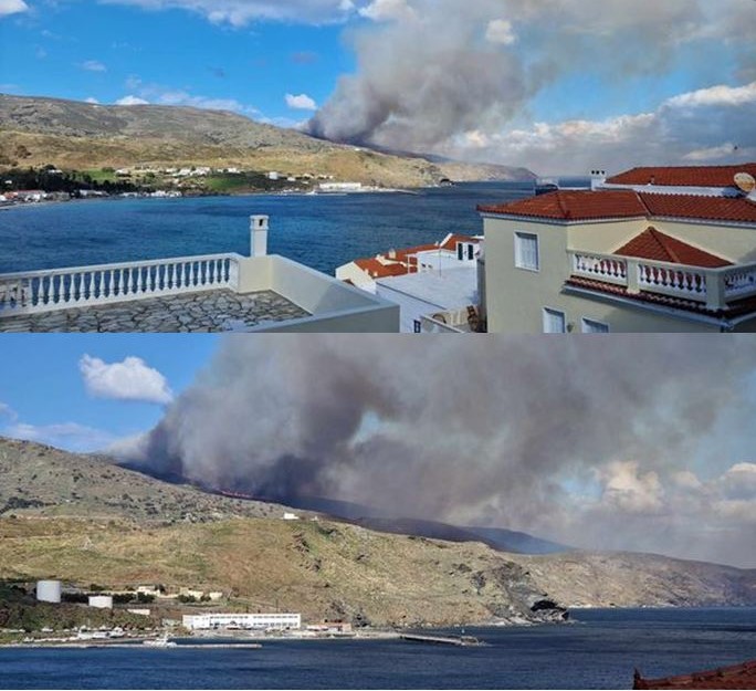 Η μεγάλη φωτιά πλέον ελέγχεται. Έχει απομείνει ένα κομμάτι προς τη θάλασσα σε μια ρεματιά. Επιχείρησαν και συνεχίζουν να επιχειρούν 50 άτομα από Άνδρο (πυροσβέστες και εθελοντές) , Αθήνα (ΕΜΟΔΕ), Σύρο και Τήνο. Έχει απομείνει ένα μικρό μέρος σε ρεματιά που πάει στη θάλασσα. Η όλη η επιχείρηση έγινε με πεζοπόρα τμήματα και υδροφόρα οχήματα, ανάλογα το μέτωπο προς τα που κινείτο.