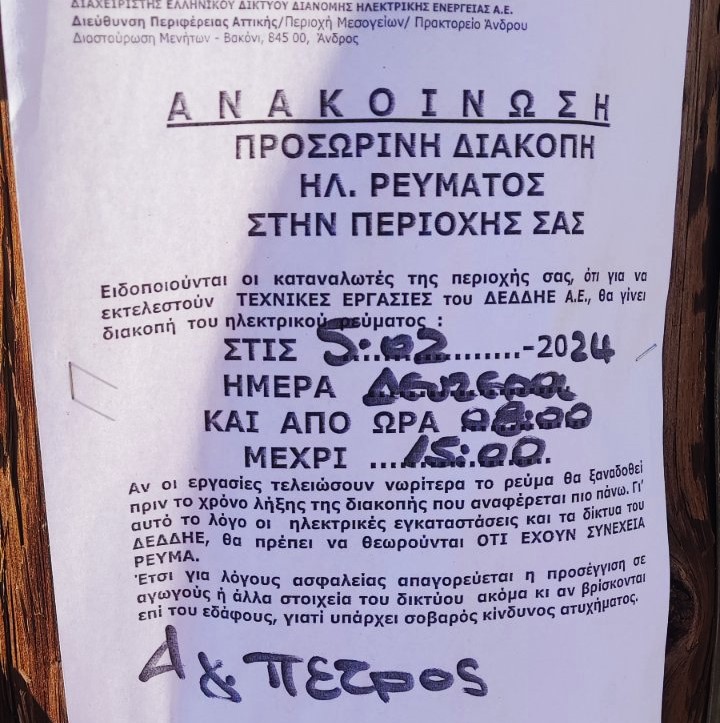 Σε συνέχεια των αντιδράσεων που έχει ξεσηκώσει η τακτική του ΔΕΔΔΗΕ να τοποθετεί τσιμεντένιους ιστούς σε διάφορα σημεία στο νησί, θα υπάρξει αντίδραση και από εμάς, τους κατοίκους του Κάτω Αγ. Πέτρου. Αύριο το πρωί στις 8:00 θα μαζευτούμε και θα αντιδράσουμε σε μία προσπάθεια να σταματήσουμε την προγραμματισμένη αντικατάσταση ξύλινων ιστών στον οικισμό μας με τσιμεντένιους, από συνεργείο εργολάβου του ΔΕΔΔΗΕ.