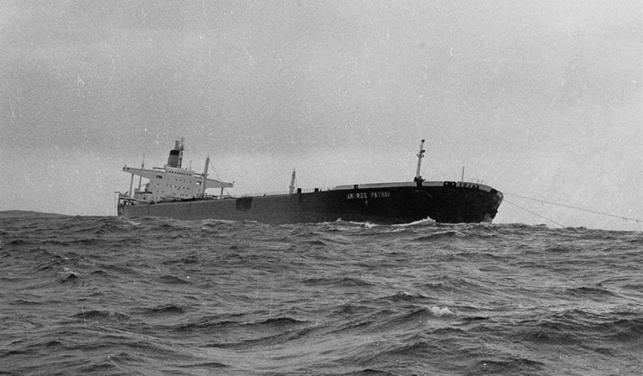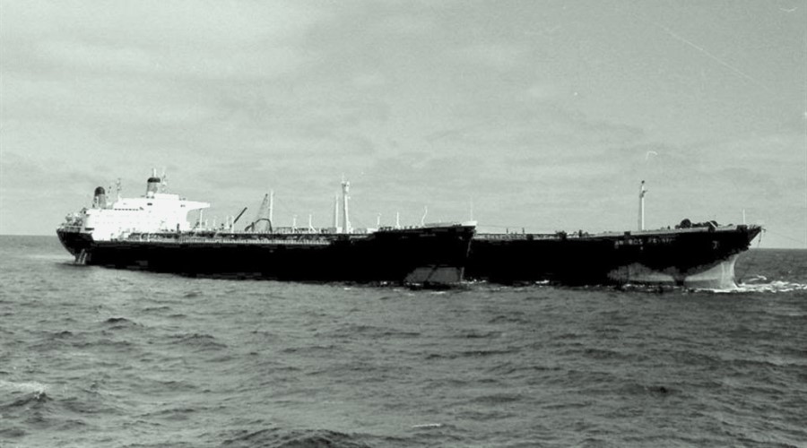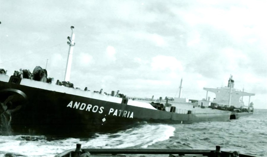 Το supertanker «Andros Patria» μετά το σβήσιμο της φωτιάς ρυμουλκούμενο πλήρες φορτίου. Το «Andros Patria», είχε μήκος 323,70 μέτρα, 48, 20 πλάτος, 25 βάθος και βύθισμα 19,20 μέτρα.