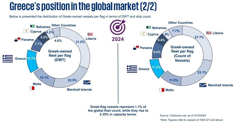 Η Ελλάδα κατατάσσεται σταθερά ως ο παγκόσμιος ηγέτης σε βασικές μετρήσεις, αντιπροσωπεύοντας το 17,4% του παγκόσμιου στόλου βάσει χωρητικότητας. Ο μέσος όρος ηλικίας των ελληνόκτητων πλοίων είναι χαμηλότερος από τον παγκόσμιο μέσο όρο και ενώ η Ελλάδα βρίσκεται πάνω από την Κίνα και την Ιαπωνία σε ελεγχόμενο DWT, εξέπεμψε λιγότερο διοξείδιο του άνθρακα από τις δύο χώρες (στοιχεία UNCTAD – 2022).