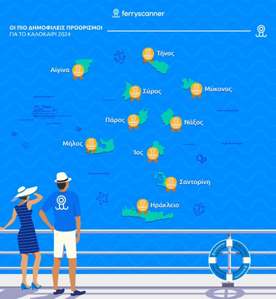 Στους δημοφιλέστερους τουριστικούς προορισμούς για τους Έλληνες αλλά και στις διαφορές που καταγράφονται σε σύγκριση με τα νησιά που επιλέγουν οι επισκέπτες από το εξωτερικό εστιάζει πρόσφατο Δελτίο Τύπου της Ferryscanner. Σύμφωνα με αυτό οι δημοφιλέστεροι προορισμοί στην Ελλάδα για το καλοκαίρι του 2024 ήταν η Πάρος, η Μύκονος, η Σαντορίνη, η Νάξος, η Τήνος, η Αίγινα, η Σύρος, η Μήλος, το Ηράκλειο και η Ίος.