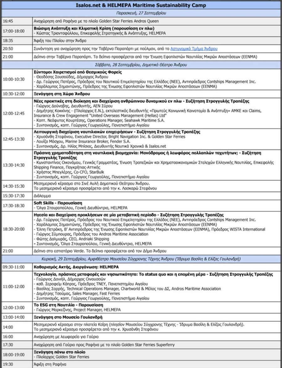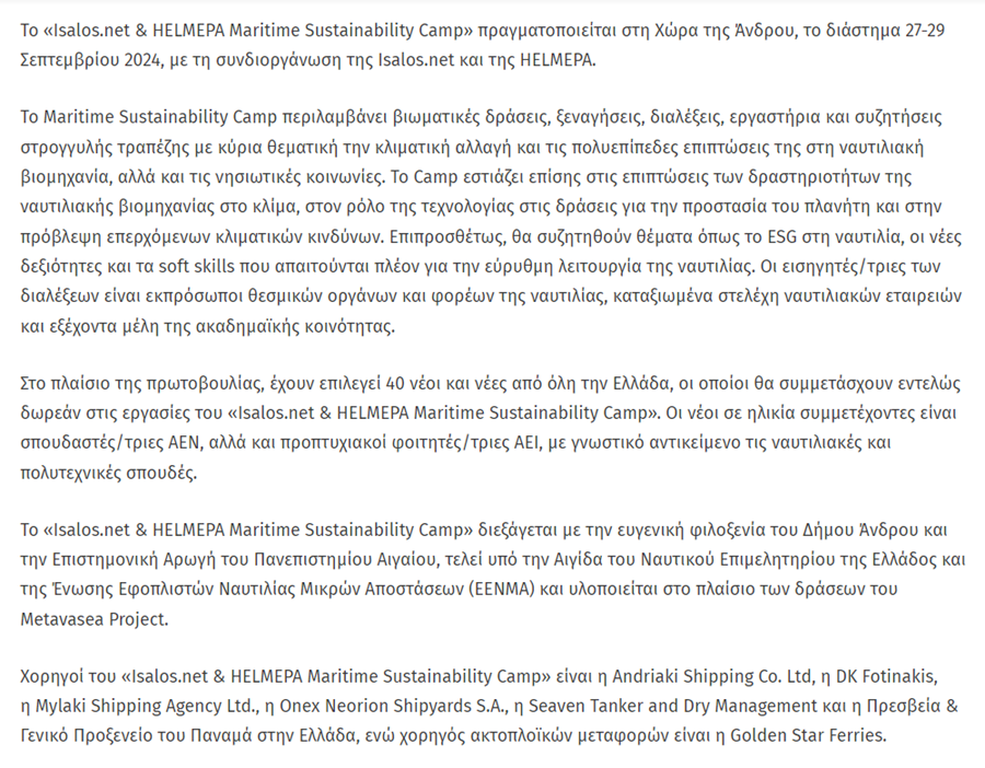 (Μια ενδιαφέρουσα δραστηριότητα θα λάβει χώρα στην Άνδρο το Σαββατοκύριακο 28-29 Σεπτεμβρίου 2024. Πρόκειται για εκπαιδευτικό σεμινάριο που συνδιοργανώνουν το "Isalos.net" και το "HELMEPA Maritime Sustainability Camp". Στα πλαίσια του εκπαιδευτικού σεμιναρίου - που θα ξεκινήσει εν πλω στο πλοίο Andros Queen την Παρασκευή 27/9, θα συνεχιστεί στην Άνδρο με ομιλίες και στρογγυλά τραπέζια το Σάββατο 28/9 και θα ολοκληρωθεί με δράσεις και επισκέψεις την Κυριακή 29/9 στην Χώρα της 'Ανδρου - συμμετέχουν 40 νέοι και νέες από όλη την Ελλάδα (σπουδαστές ΑΕΝ, φοιτητές με αντικείμενο τη ναυτιλία κλπ). Θα μιλήσουν στελέχη ναυτιλιακών εταιρειών, καθηγητές, κλπ. Από την μεριά της Άνδρου ξεχωρίζουμε την συμμετοχή της Χρυσάνθης Στεφάνου στο στρογγυλό τραπέζι για την διαχείριση των ναυτιλιακών επιχειρήσεων. Το Εν Ανδρω ευχαριστεί τη ναυτιλιακή εταιρεία Golden Star Ferries - που είναι και ο χορηγός μεταφορών της εκδήλωσης - για την πληροφόρηση που μάς παρείχε σχετικά με το σημαντικό αυτό γεγονός. Ακολουθούν το ΔΕΛΤΙΟ ΤΥΠΟΥ και το ΠΡΟΓΡΑΜΜΑ της διοργάνωσης - ΕΝ ΑΝΔΡΩ)