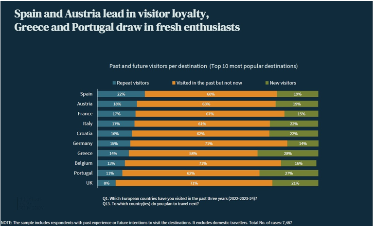 Η Ελλάδα με ποσοστό 5,9% είναι υψηλότερο από το 5,4% πέρυσι βρίσκεται στην τέταρτη θέση ως επιλογή μεταξύ των ευρωπαίων που θα ταξιδέψουν φέτος, με την Ισπανία να παραμένει στην κορυφή με 7,8% έναντι 7,6% πέρυσι την ίδια περίοδο, την Ιταλία να ανεβαίνει στην δεύτερη θέση με 7,6% έναντι 7,0% πέρυσι και την Γαλλία να υποχωρεί στην τρίτη θέση με 7,0% έναντι 7,2% το 2023, όταν ήταν δεύτερη.