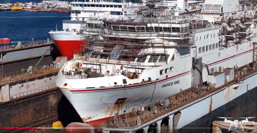 To Andros King το είχαμε παρουσιάσει όταν ήρθε στην προβλήτα της ΔΕΗ στον Πειραιά stiw 12 Οκτωβρίου 2024. Σχεδόν ενάμιση μήνα μετά βρίσκουμε το πλοίο των αδελφών Στεφάνου στην δεξαμενή του Περάματος με τις εργασίας ανακαίνισης (μετατροπές, αλλαγές, βαψίματα, ανακατατάξεις μέσα κι έξω να έχουν προχωρήσει σχετικά γρήγορα. Το πλοίο ξανακτίζεται κυριολεκτικά. Όλα αλλάζουν.