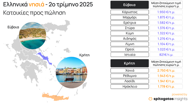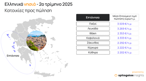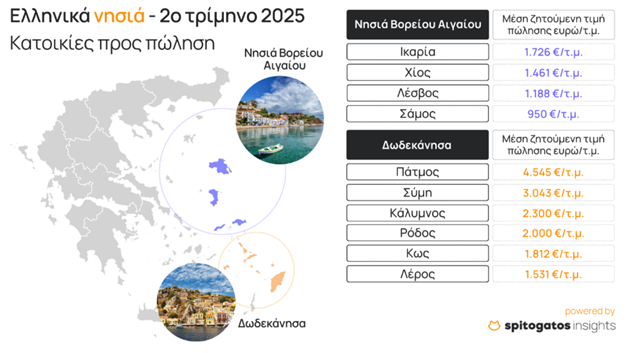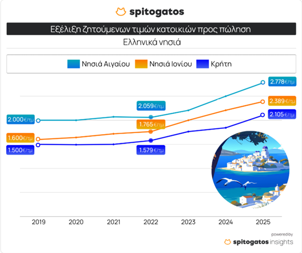 Τα νησιά του Αιγαίου συνεχίζουν να σημειώνουν τις μεγαλύτερες αυξήσεις, με τη Μέση Τιμή πώλησης κατοικίας το 2025 να φτάνει τις 2.778 €/τ.μ., αυξημένη κατά 38,9% από το 2ο τρίμηνο του 2019.