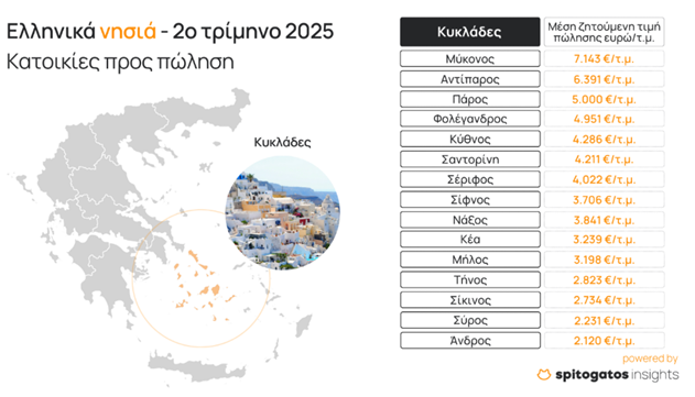 Τεράστιες διακυμάνσεις παρατηρούνται στις Κυκλάδες, με τα περισσότερα νησιά να καταγράφουν αυξήσεις στις τιμές πώλησης κατοικιών. Εξαίρεση η Νάξος, η Σέριφος και η Σίκινος, όπου οι τιμές παραμένουν σχετικά σταθερές σε σύγκριση με την αντίστοιχη περίοδο του 2024. Σημαντική ετήσια άνοδος, άνω του 20%, παρατηρείται σε Αντίπαρο και Φολέγανδρο, συγκριτικά με το 2ο τρίμηνο του 2024. Τα ακριβότερα σε κατοικίες νησιά των Κυκλάδων την ίδια περίοδο είναι η Μύκονος, η Αντίπαρος και η Πάρος. Τα οικονομικότερα σε κατοικίες η Σίκινος, η Σύρος και η Άνδρος!...