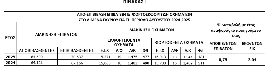 Από την Λιμενική Αρχή Άνδρου ανακοινώνονται τα ακόλουθα στατιστικά στοιχεία της κίνησης των επιβατών, που κατέφθασαν με Δρομολογημένα Πλοία στο νησί της Άνδρου κατά τη περίοδο 01-31 Αυγούστου 2025, όσο και των οχημάτων που φορτώθηκαν εκφορτώθηκαν σε αυτά κατά την ίδια χρονική περίοδο, ενώ παρατίθενται και συγκριτικά στοιχεία με την αντίστοιχη περίοδο του 2024.