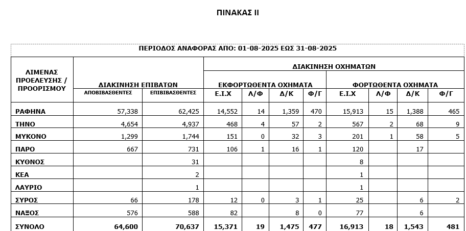 Τελικά ο Αύγουστος έκλεισε με θετικό πρόσημο. Άνοδος 0,75% στους επιβάτες και 2,04% στους επιβάτες. Αριθμητικά συνολικά έφτασαν στο νησί τον Αύγουστο 64.600 επιβάτες και 15.351 οχήματα. Ήτοι, περισσότεροι από πέρσι 479 επιβάτες 308 οχήματα. Οι 57.338 ήρθαν από Ραφήνα. Από τα άλλα νησιά ήρθαν 4.654 από Τήνο, 1.299 από Μύκονο, 667 από Πάρο, 576 από Πάρο και  66 από Σύρο.