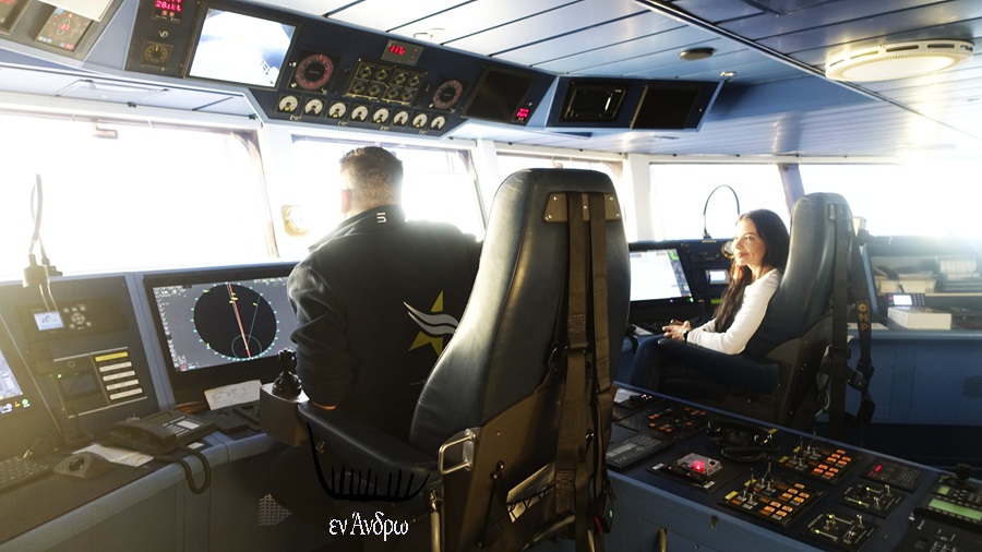 Η έκπληξη. Δίπλα στον καπετάν Γιάννη Βουτσελάκο, στο πιλοτήριο του πλοίου, η Χρυσάνθη Στεφάνου. Δεν θα έχανε το πρώτο αναγνωριστικό ταξίδι του νέου ταχύπλοου της Golden Star...