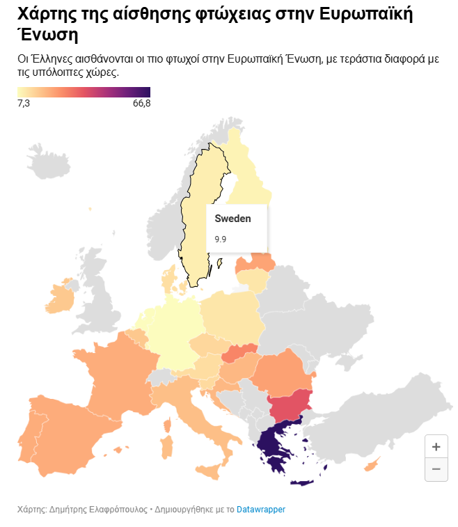 Όπως αποτυπώνεται στον χάρτη η Ελλάδα εμφανίζει τα υψηλότερα ποσοστά με διαφορά στον δείκτη υποκειμενικής φτώχειας σε σχέση με τις υπόλοιπες χώρες της Ευρωπαϊκής Ένωσης.