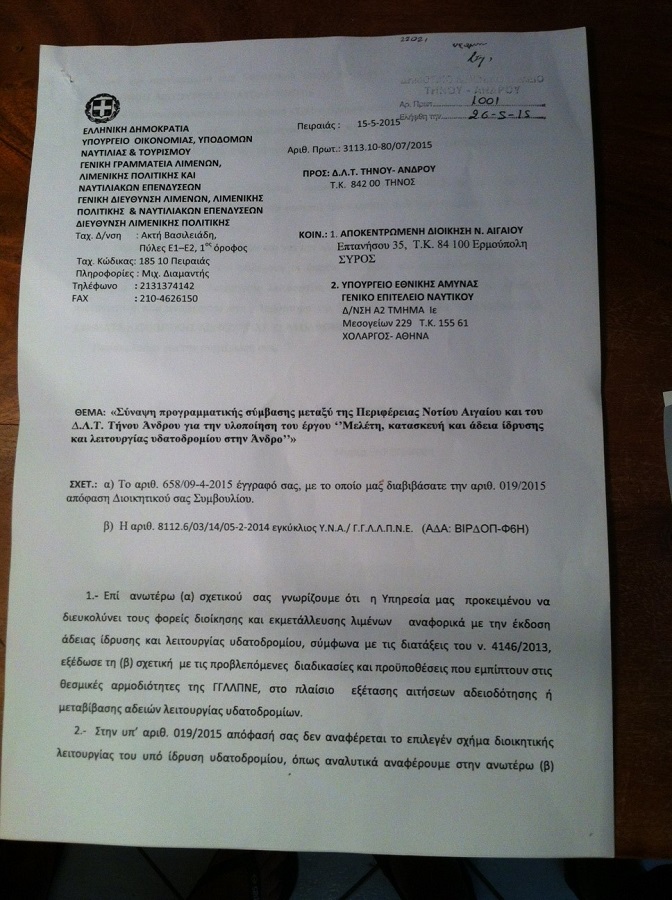 «Στην υπ αριθ. 019/2015 απόφαση σας, δεν αναφέρεται το επιλεγέν σχήμα διοικητικής λειτουργίας του υπό ίδρυση υδατοδρομίου στην Άνδρο.»