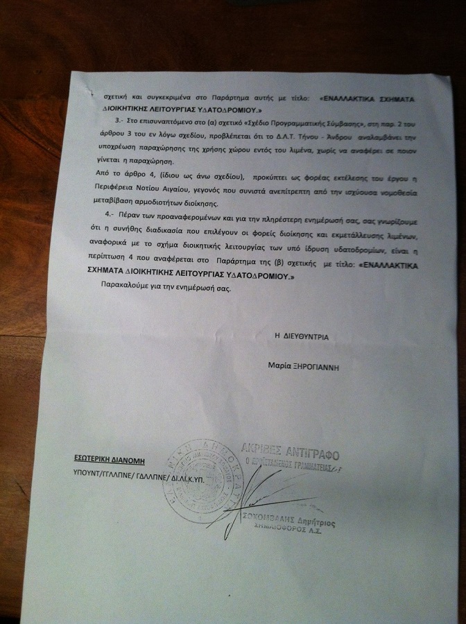 Με ημερομηνία 15.5.2015, παραλήπτη την Περιφέρεια Νοτίου Αιγαίου και κοινοποίηση το Γενικό Επιτελείο Ναυτικού, αναφέρει επί λέξει στην παράγραφο 2: